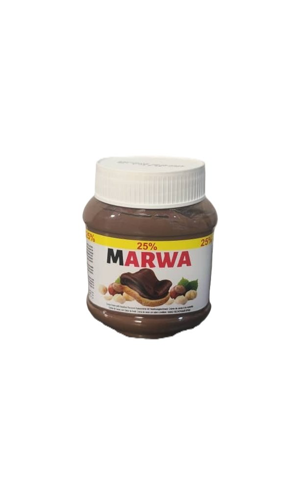 La crema de avellana y cacao MARWA es un producto para untar de origen turco, con un peso de 350 g, elaborada principalmente con azúcar, cacao (5%) y pasta de avellana. Se recomienda conservarla en un lugar fresco y seco, lejos de la luz solar directa.