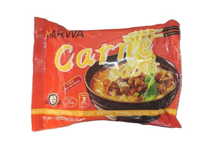 Los fideos instantáneos sabor carne MARWA vienen en presentaciones de 65–85 g, listos en 3 minutos, elaborados con harina de trigo y un sazonador con sabor a carne. Son prácticos, económicos y se comercializan en Cuba en paquetes múltiples.