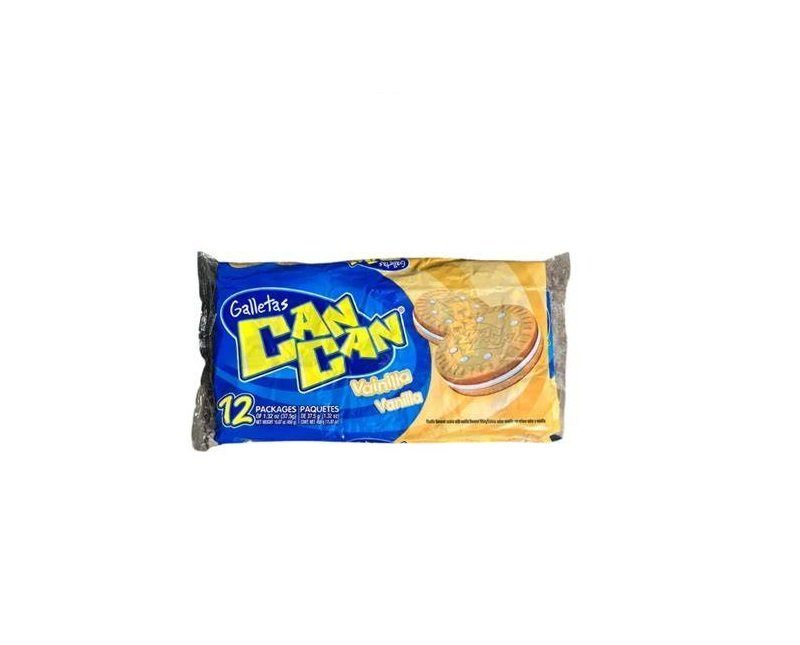 Las Galletas Can Can sabor vainilla con relleno de vainilla son galletas crujientes rellenas con una crema suave y dulce de vainilla. Se presentan en paquetes individuales de 37.5 g y en cajas de 12 unidades (450 g en total), muy populares en Centroamérica por su sabor clásico y práctico formato.