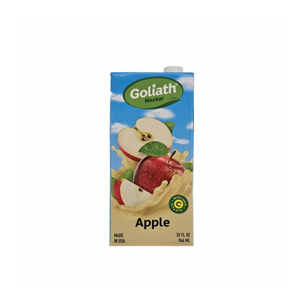 El néctar de manzana GOLIATH de 946 ml es una bebida saborizada elaborada con jugo de manzana a partir de concentrado, endulzada con jarabe de maíz de alta fructosa y enriquecida con vitamina C. Su país de origen es Estados Unidos.