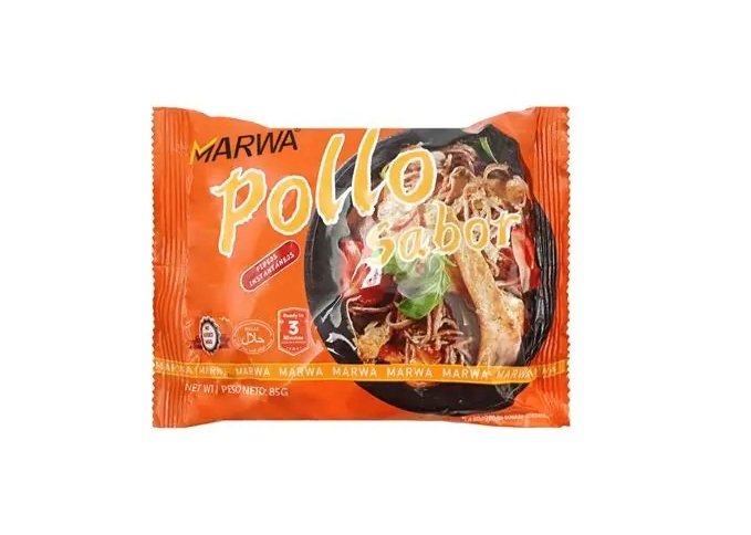 Los fideos instantáneos sabor pollo MARWA vienen en sobres de 85 g, elaborados con harina de trigo refinada y aceite de palma, acompañados de un sobre de condimento con especias y potenciadores de sabor. Son un producto panameño muy distribuido en Cuba, especialmente en tiendas online y físicas.